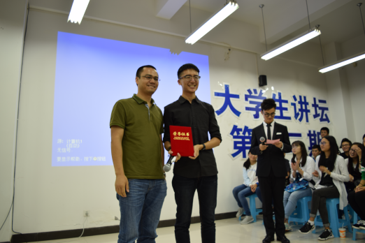 活动最后,学生处廖愉平老师为主讲人颁发证书,并对本次活动作总结发言。廖老师讲道,举办大学生讲坛我们共有“一个目的两个希望”:一个目的是通过请优秀学长为大一新生解答疑惑,能够让同学们更快地融入大学生活,两个希望是:一是希望同学们在大学期间能够有一个规划,能够明白自己将来要成为什么样的人;二是希望能够通过“大学生讲坛”这个活动,以后涌现出更多的像朱敏学长这样优秀的主讲人,为学弟学妹们分享精彩人生。